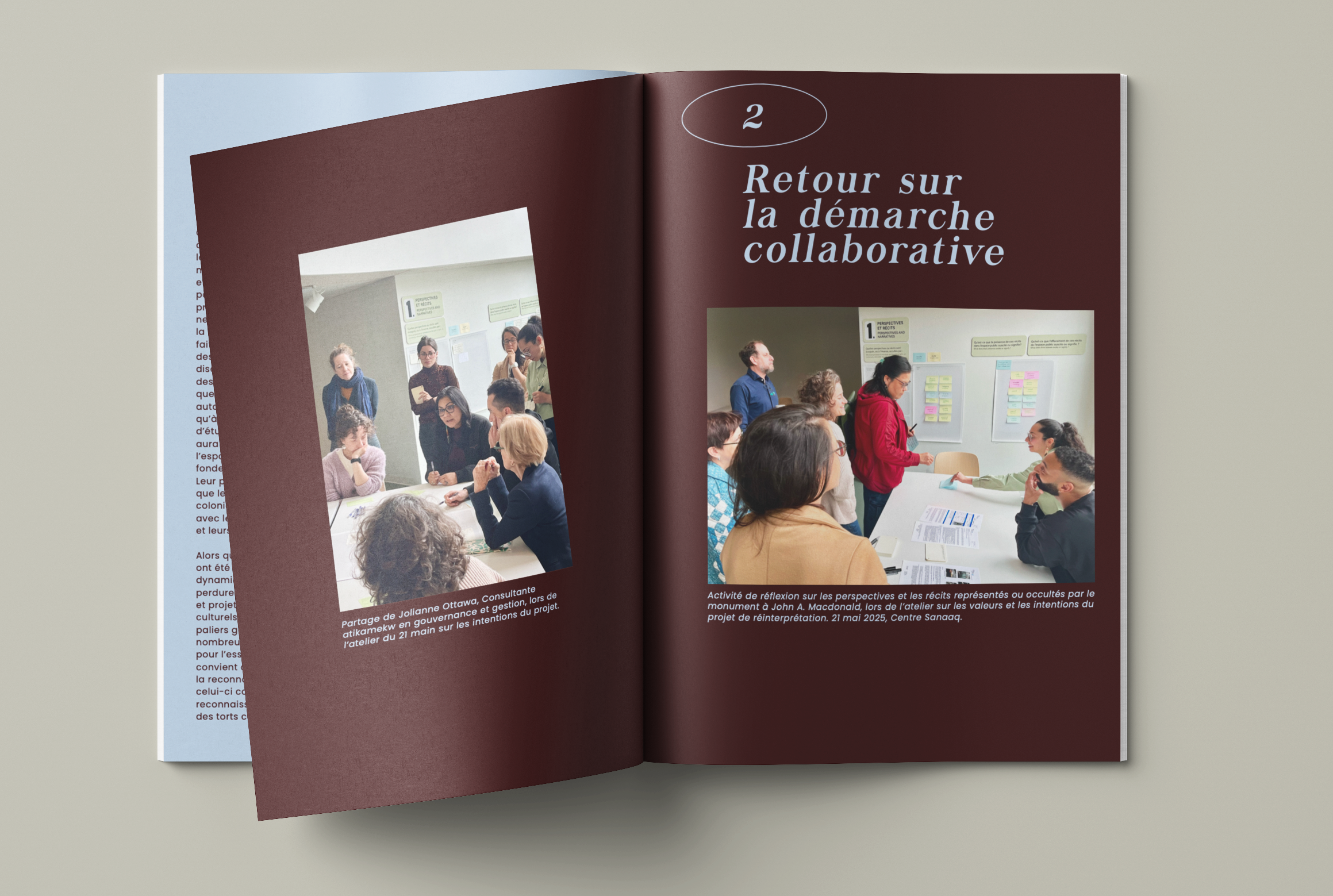 Pour cheminer dans cette démarche, plusieurs mois de recherche et une série d’ateliers participatifs ont été réalisés, mobilisant de nombreuses parties prenantes externes reflétant la multidisciplinarité intrinsèque à la réflexion (artistes et commissaires, institutions muséales, membres de différentes communautés autochtones, professionnel·le·s en aménagement, en histoire, en patrimoine, en archéologie et en muséologie).